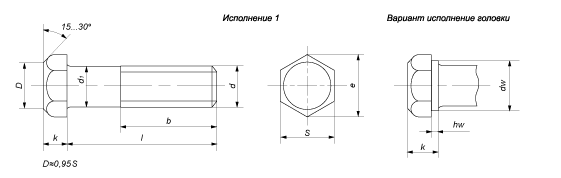 • исполнение 1: у болта диаметр гладкой части соответствует значению номинального диаметра;